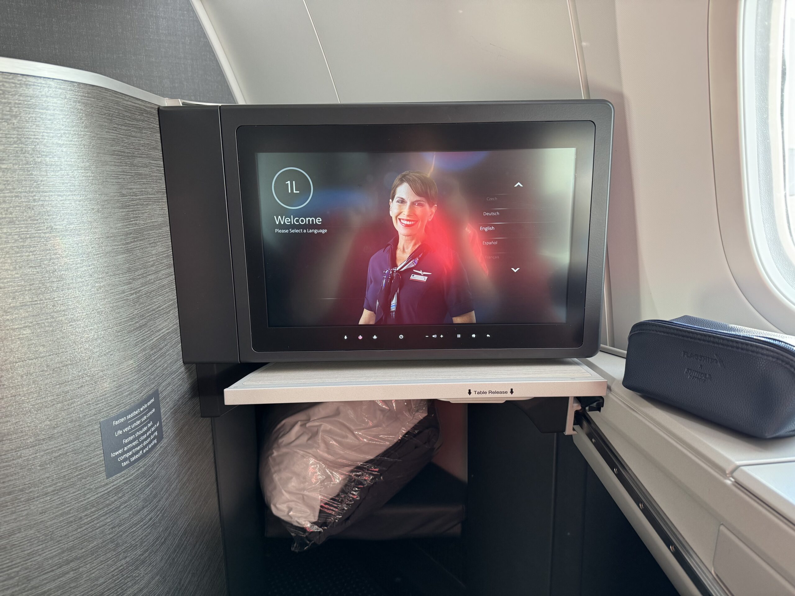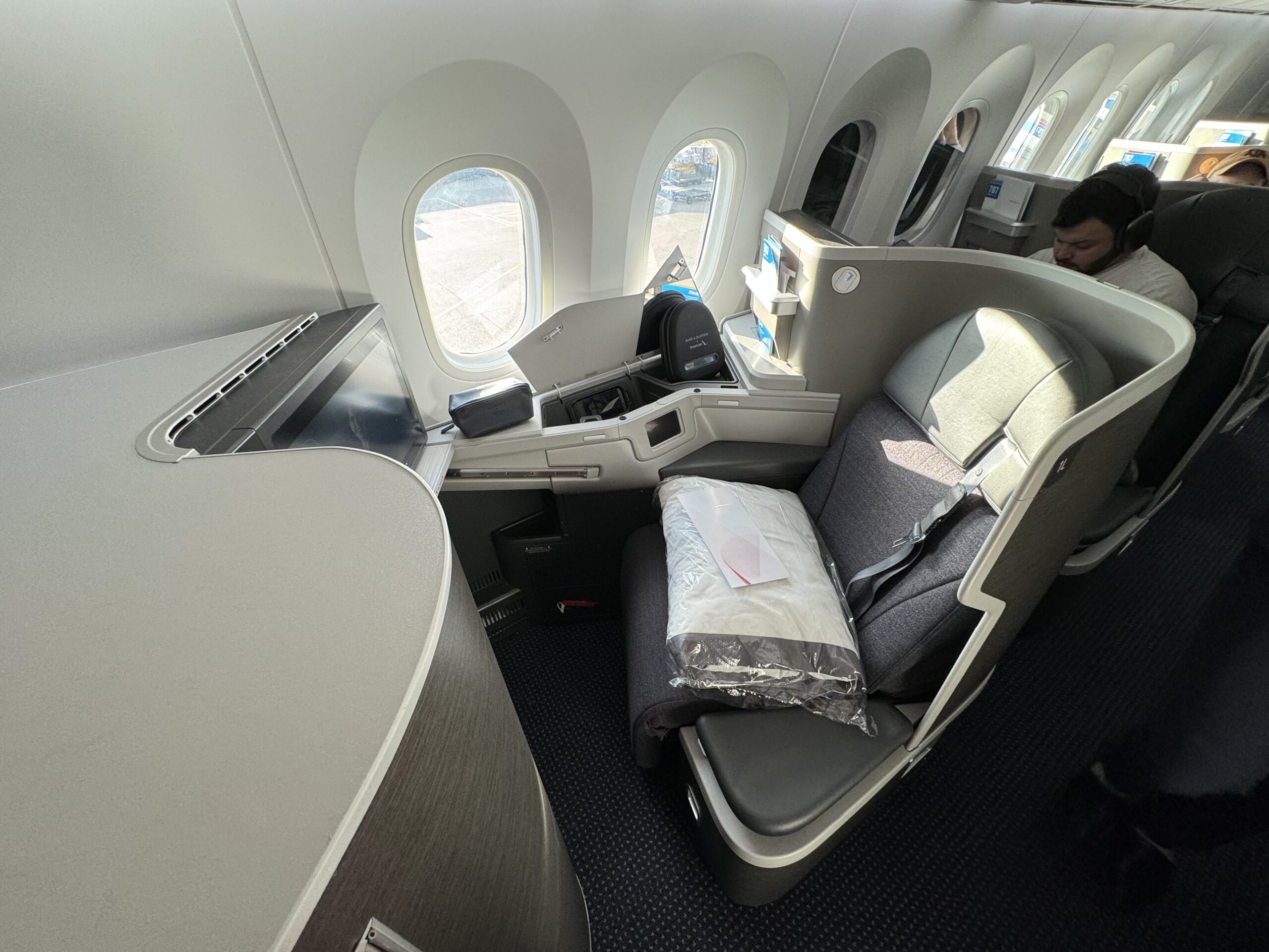 這裡值得說一下,AA的波音787-8有好幾種座型分佈,一般都是5排商務艙,橫向1-2-1排布;摟主搭乘的本次航班是所有乘客面朝前的反魚骨式,而另一種是雙排座位腳朝外的;如果是進化型的波音787也就是787-9的話,則是全部面朝前的反魚骨並且商務艙共8排座,具體可以參考: