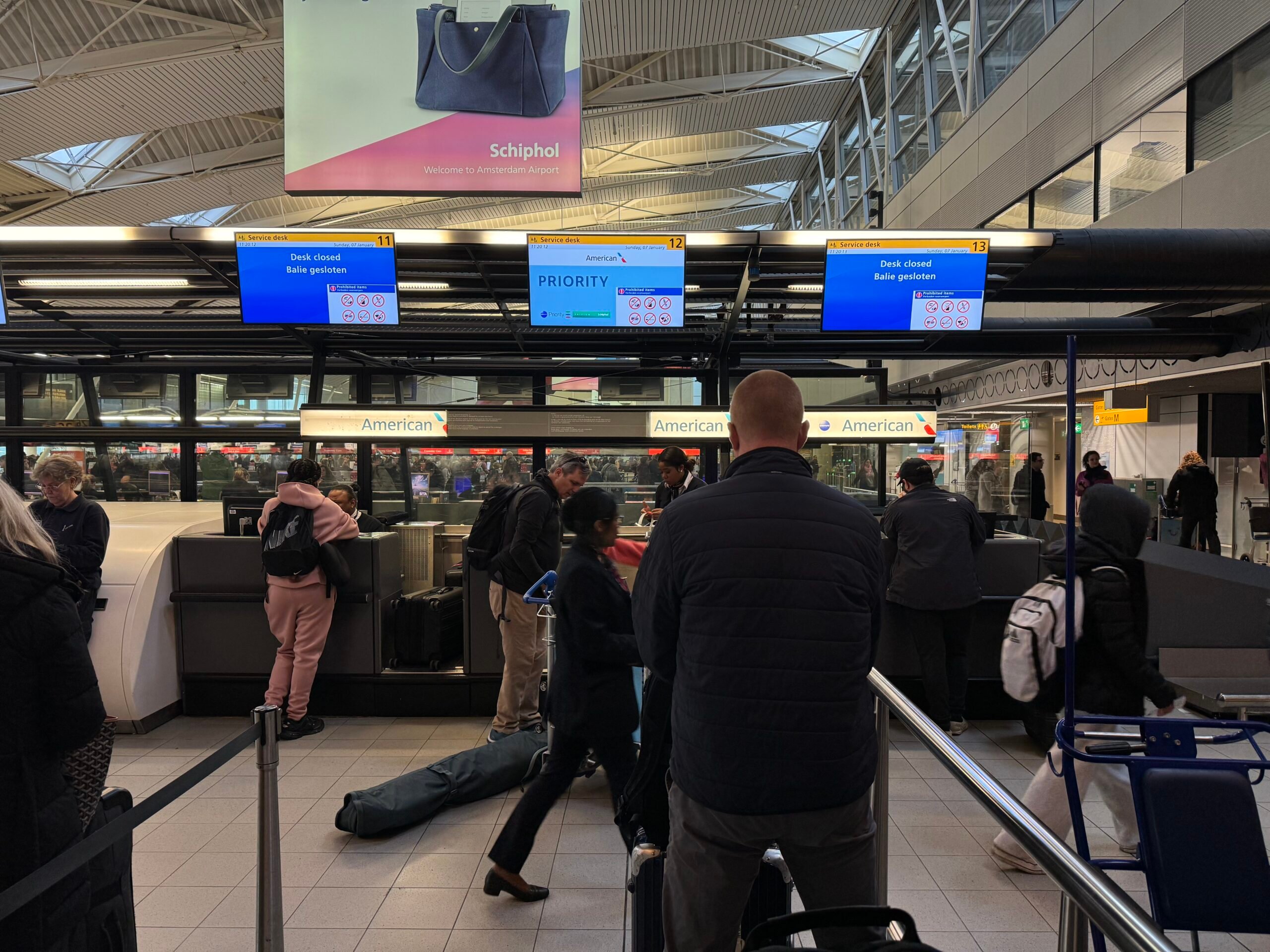從機場喜來登酒店出來走幾步就能回到機場啦,值機櫃檯也開了,歐洲的朋友跟我說,荷蘭這個機場是典型的小而繁忙,利用率極高的,確實人山人海但沒到影響移動速度的程度;但,這AA PRIORITY check-in辦理速度比economy的慢著實讓人捉急
