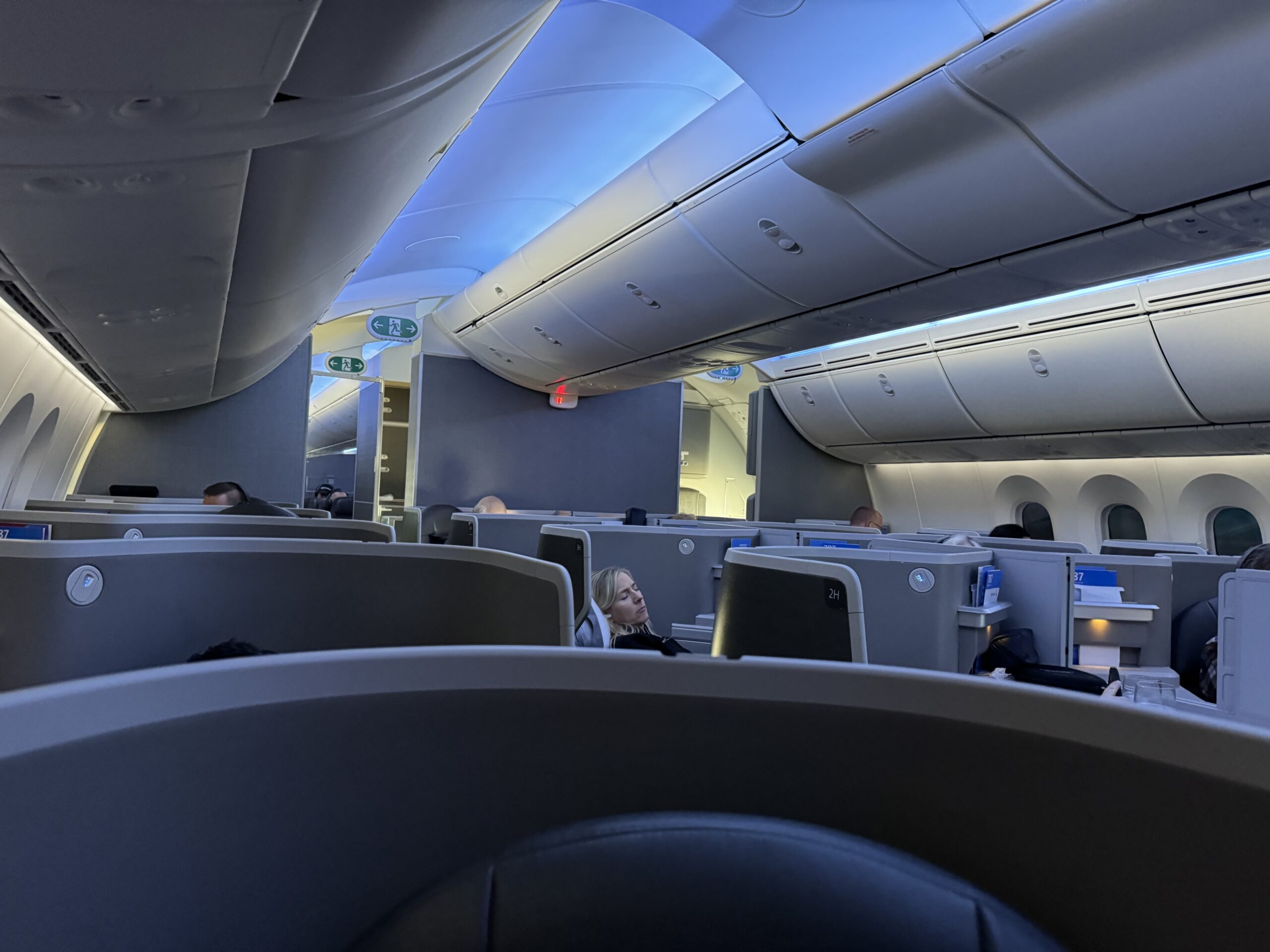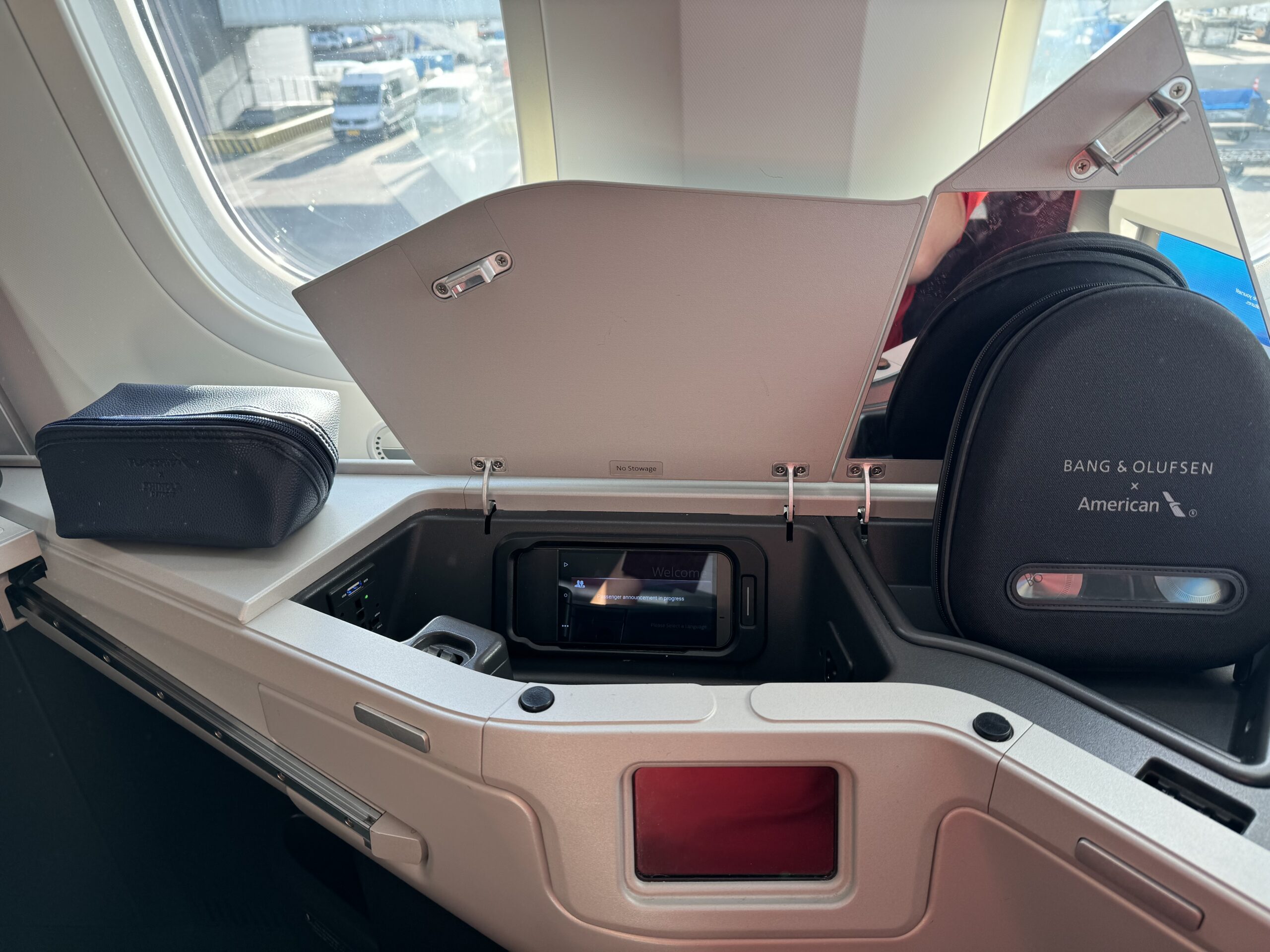 這裡值得說一下,AA的波音787-8有好幾種座型分布,一般都是5排商務艙,橫向1-2-1排布;摟主搭乘的本次航班是所有乘客面朝前的反魚骨式,而另一種是雙排座位腳朝外的;如果是進化型的波音787也就是787-9的話,則是全部面朝前的反魚骨並且商務艙共8排座,具體可以參考: