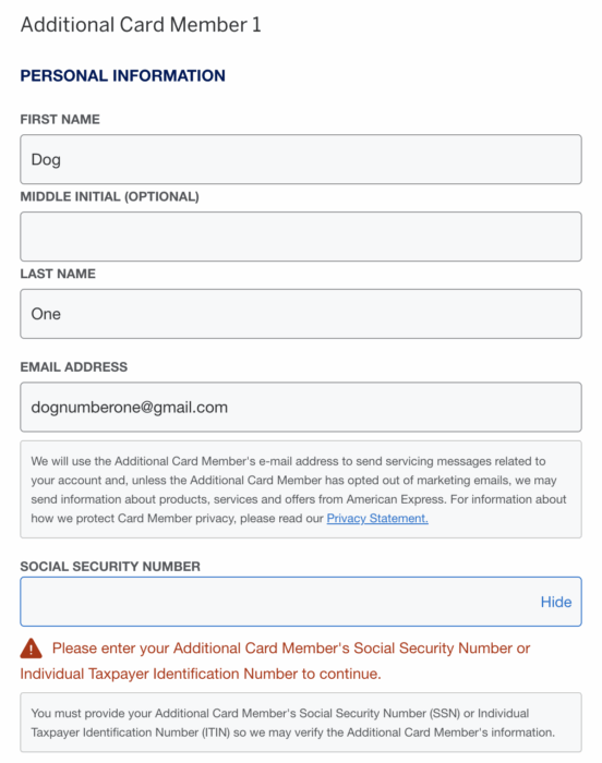 【2025.11 更新】自从2025.11.18起,AmEx加副卡就必须填SSN了,见下图。这样一来,以前给宠物加副卡撸offer的路子就死了,给有SSN的真人加副卡会影响信用报告,很得不偿失。这样一来这篇文章的副卡活动基本上就算是死了。R.I.P.