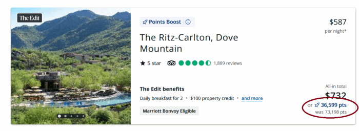 那么Chase The Edit有没有做的比FHR更好的地方呢?有 – Points Boost是目前最大的甜点。Chase和Amex都允许预定时使用积分抵扣部分或全部现金价,但Amex是按照每100分抵扣$1,而Chase则有一个Points Boost项目,让部分酒店可以使用出2 cpp的价值,目前来看似乎所有的Edit酒店都自动参与Points Boost 2x,那么这就让即使价格虚高的情况下,也能让Chase UR分用出不错的价值。比如The Ritz-Carlton, Dove Mountain,我们查询一个日期的含税价格是$718,在相同的日期Chase The Edit上面价格稍高一些,为$732, 但是由于Points Boost可以用出双倍价值,实际只需要36.6k的UR积分就可以拿下,同时不影响享受项目福利,可以算是个很不错的deal了。