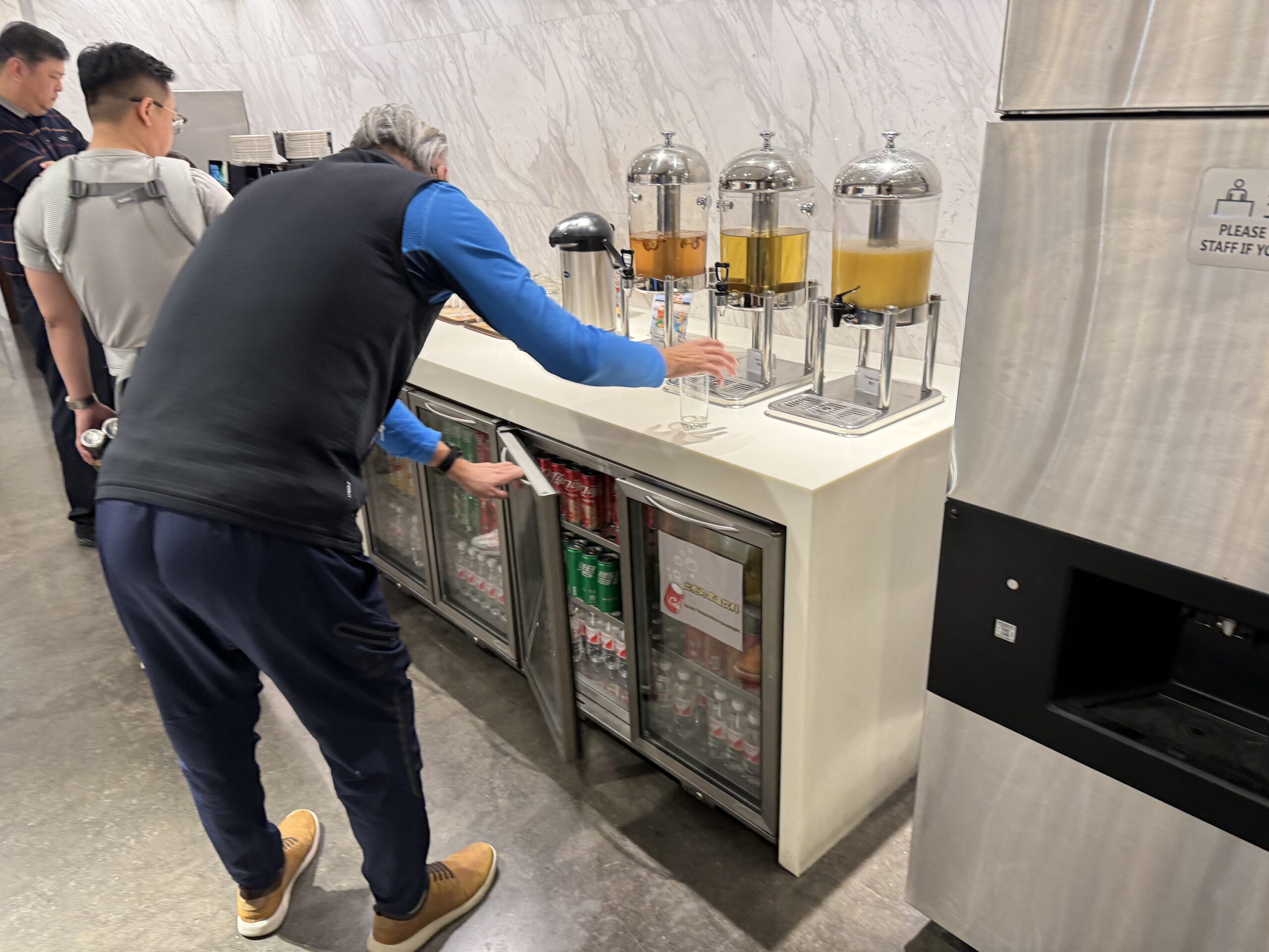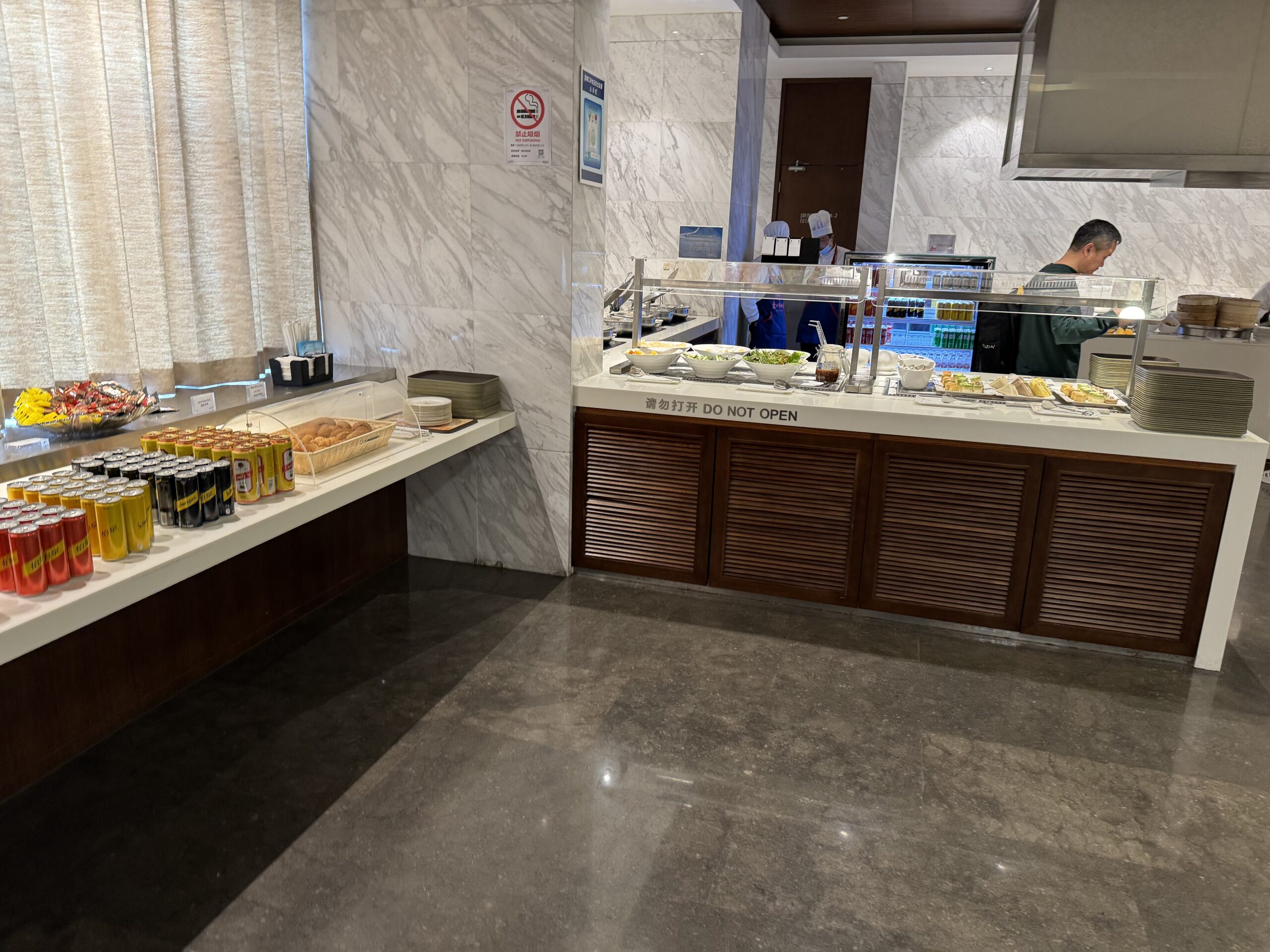 很遺憾,前台告知「豪華商務艙」不能享「頭等艙」待遇進東航白金卡/東航頭等艙休息區(進門右轉),但後來看地圖發現其實「頭等艙」那一側也就只是一片單獨的安靜區域,餐食洗澡什麼的全是在商務艙休息室這邊(進門左轉);商務艙休息室共兩層,由電扶梯連接;