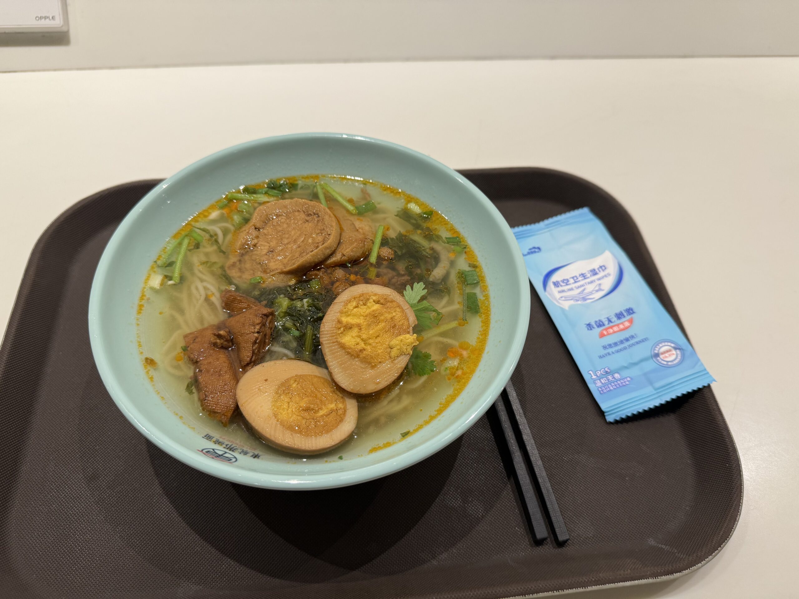 取餐區挺小的,布置得比較隨心所欲。我一直以為東航「那碗面」是面的牌子,是某個特定的口味,這次去才知道是每個地方各有自己特色的面;因為起飛時間是中午所以早餐什麼的就沒怎麼拿因為已經在酒店吃了,這碗面自己搭配的,然後自己加了一些素雞、豆腐跟滷蛋;