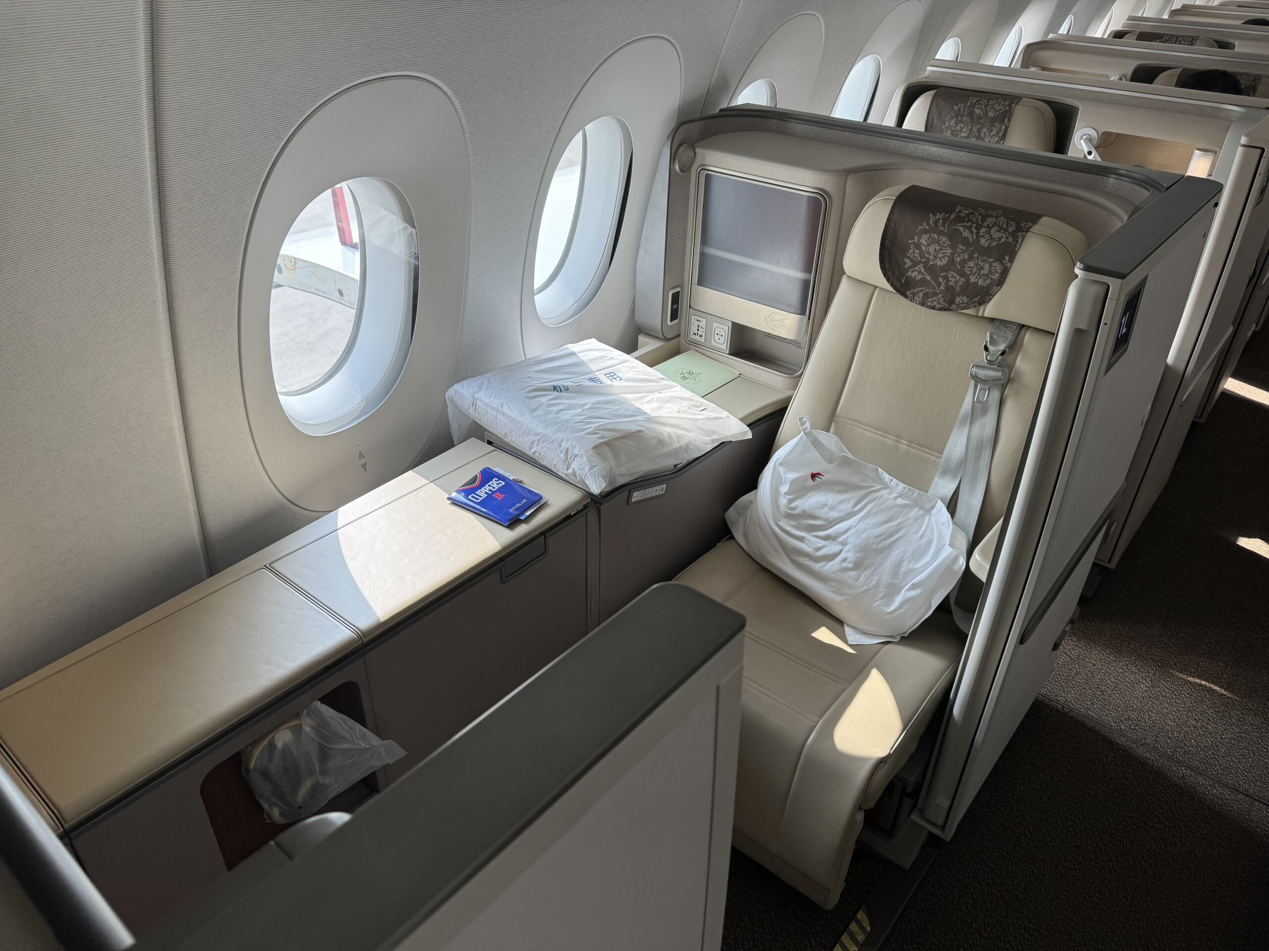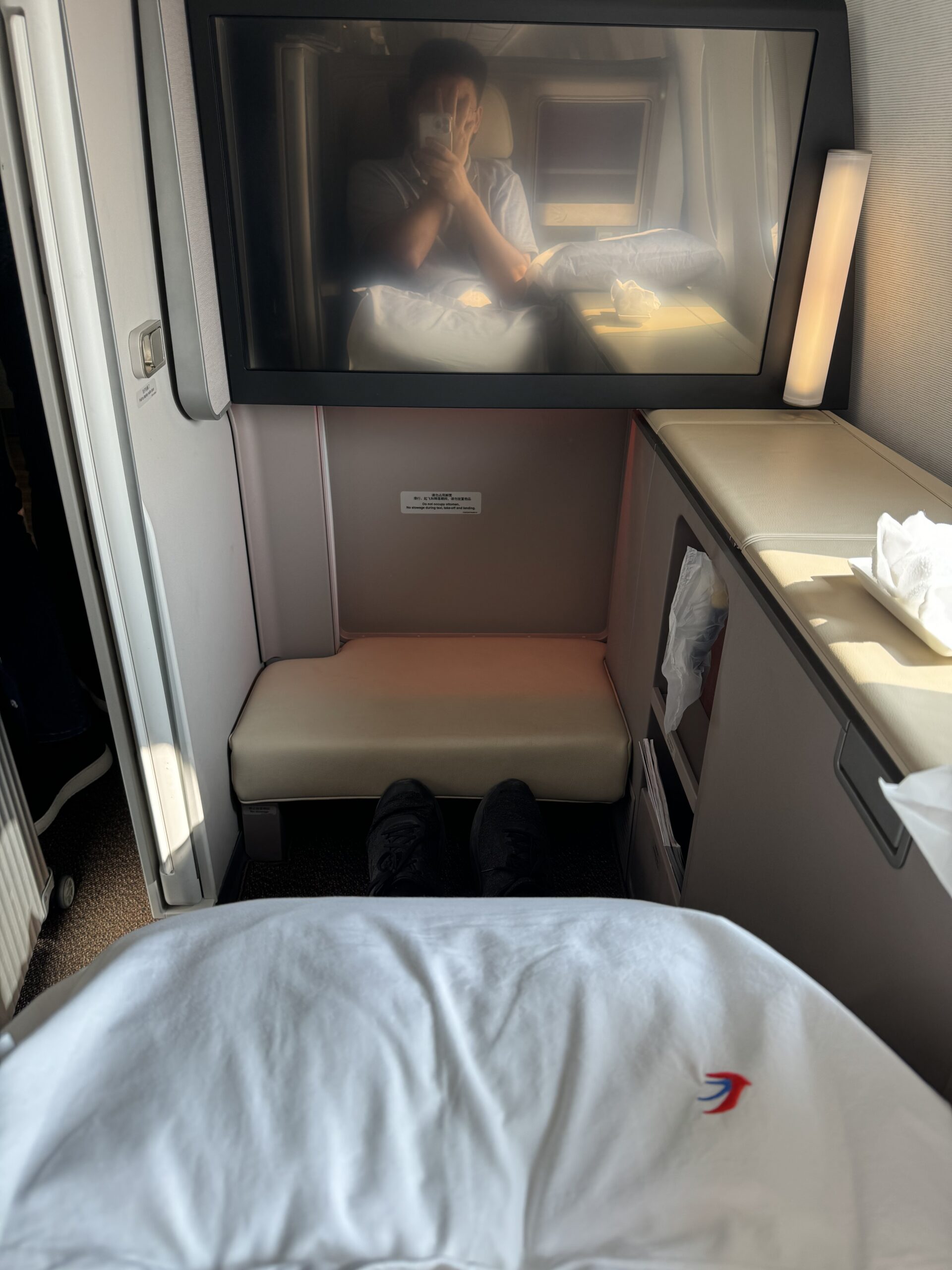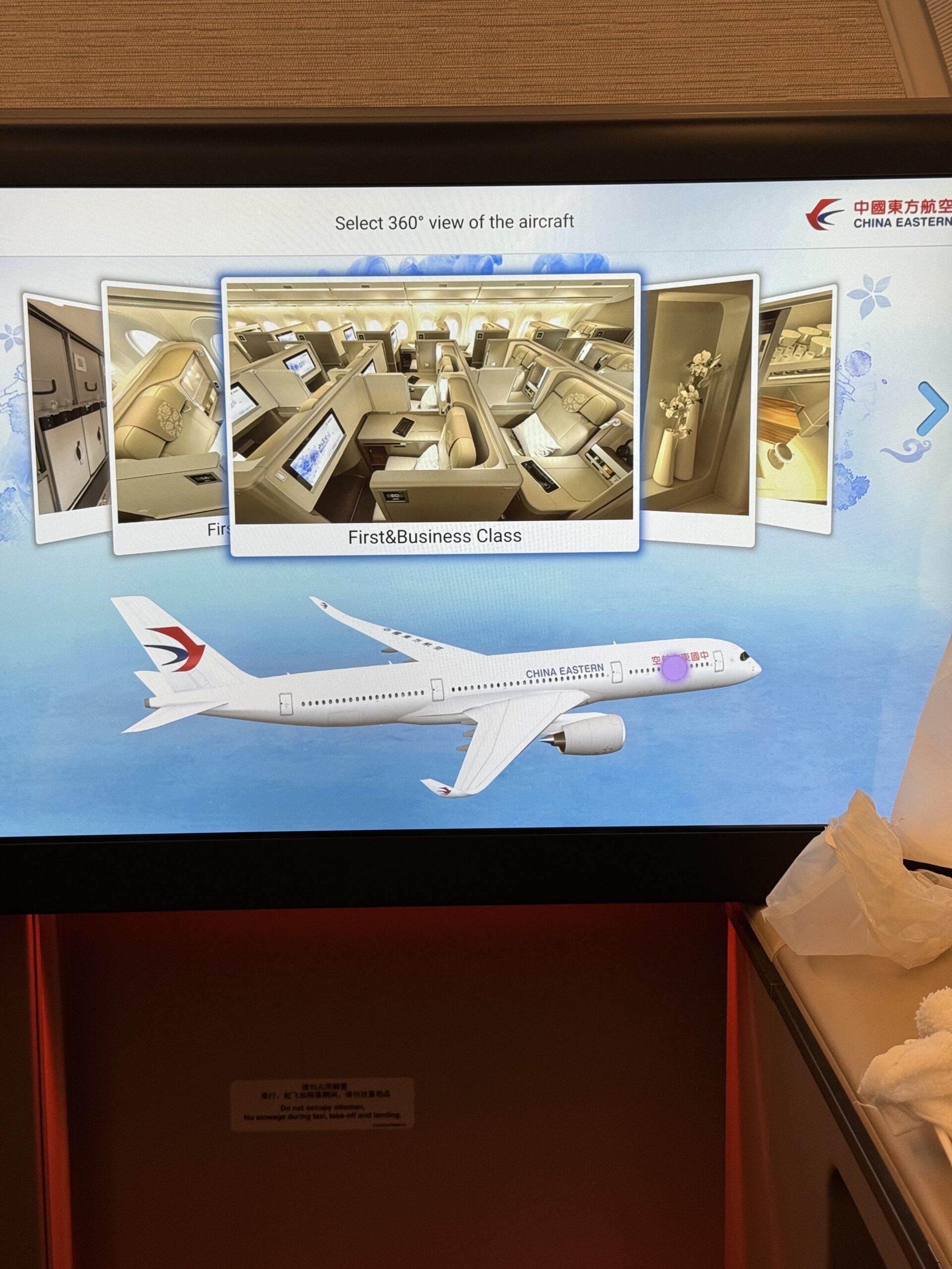另外需要注意的是,根據網上其他人的經驗,如果一開始東航就確定了機型為A350的話,豪華商務艙這一排是無法通過外航的里程兌換的,甚至東航自己的里程也不能兌換,而是只能通過在check-in時候加錢(據說是1000 USD左右)或機上加錢(據說是2000 USD左右)以從一般商務艙升級到第一排的豪華商務艙。