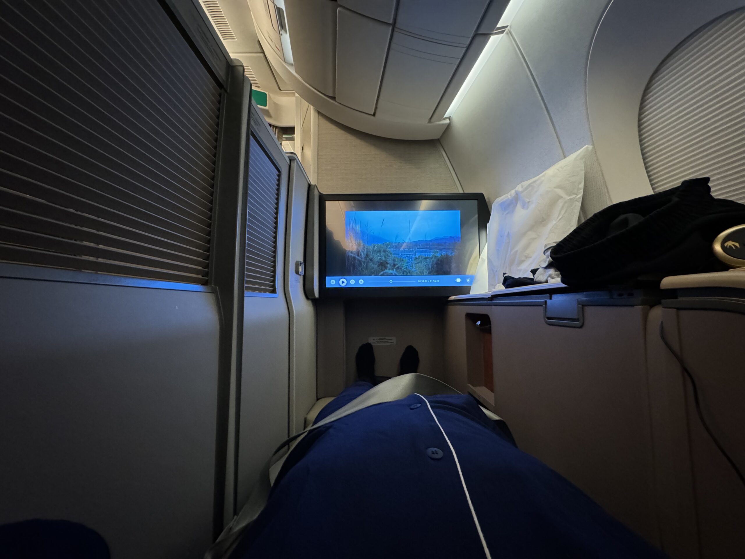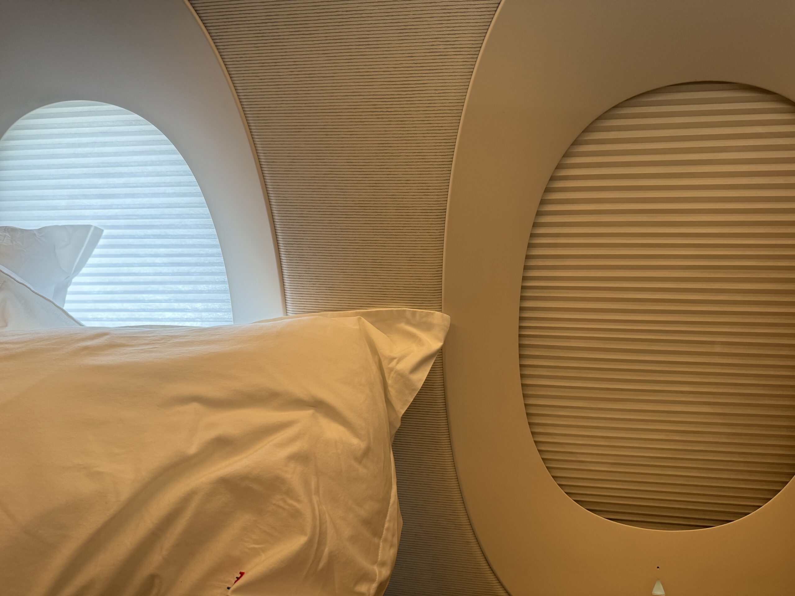 最後說一下休息體驗,兩艙最值錢的是空間,「豪華商務艙」夠長,縮腿沒問題,絕對不會撞膝蓋(對於185 cm身高的摟主),但是寬度一般;摟主睡覺時喜歡雙手蓋肚臍的平躺睡姿,用這個姿勢的話,肘關節會碰到旁邊,這樣大家就能看出寬度受限的問題了……所以手要繼續向下摸,才不會手肘抵着