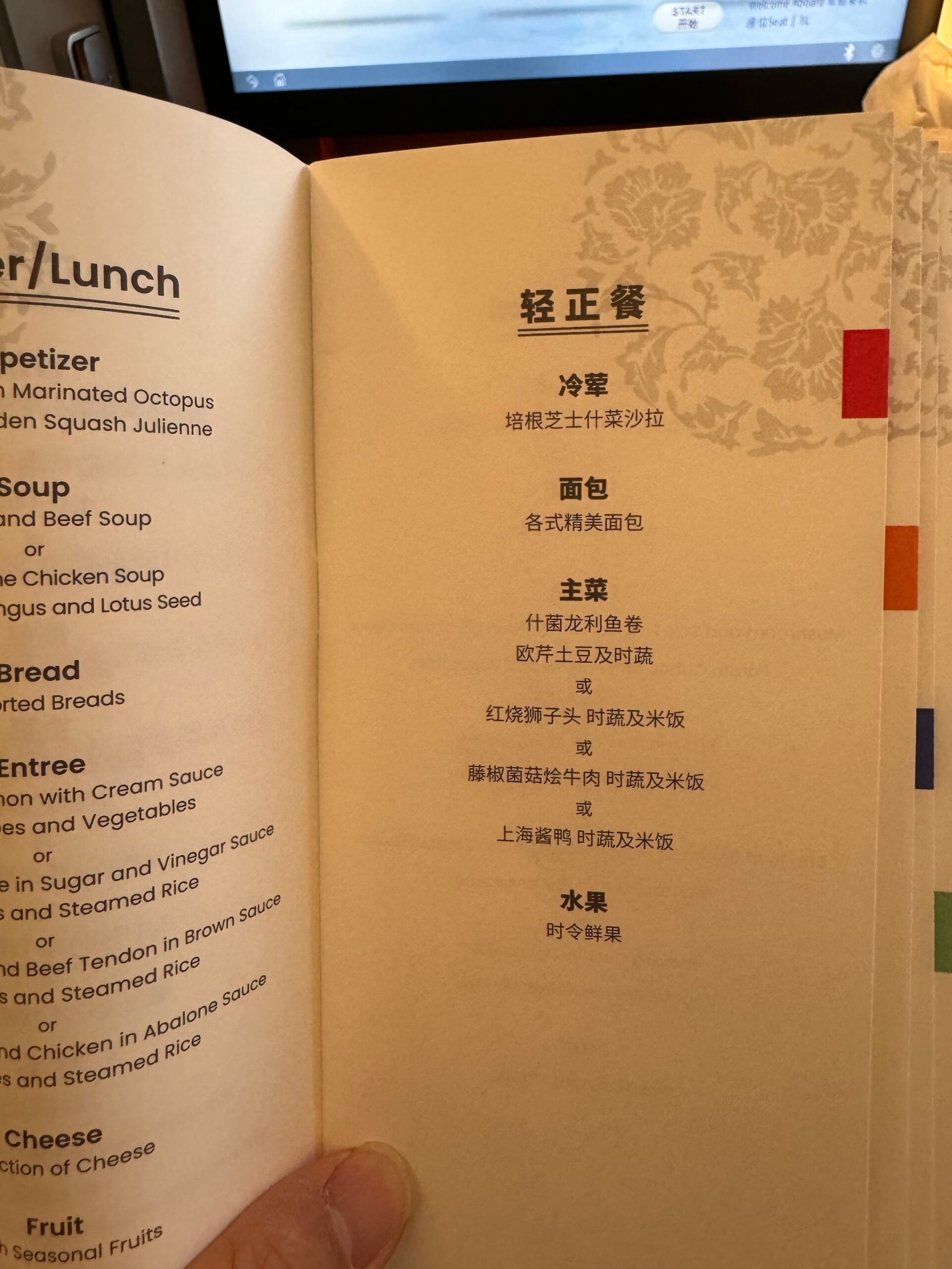 起飛後不久準備上正餐,先來看看菜單吧,菜單上只有正餐(起飛後)跟輕正餐(降落前),隨時供應的輕食未寫明在菜單上