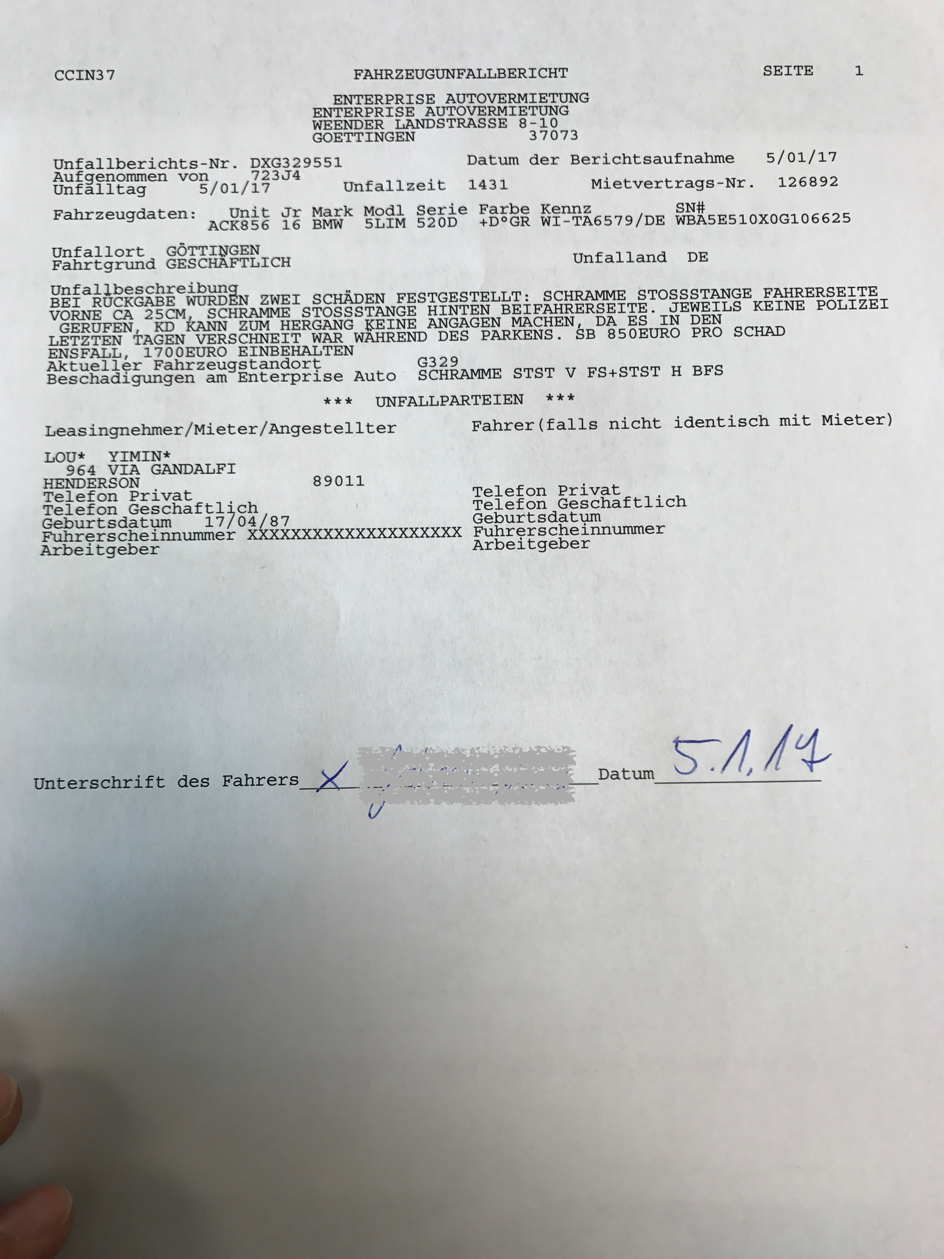 看圖!就這兩處看起來「不太值錢」的刮痕竟然要價整輛車錢的十分之一(同款二手車€17,000確實可以拿下了)。震驚之餘,頓時疑心當初給我免費升四級難不成是一個圈套?顯然乞丐車的損傷就不用這麼貴了……經理問我是否知道怎麼弄壞的,我下意識就回答不知道,可能停在路邊被別人碰了吧,希望能藉此躲責。其實,後保險杠的撞傷來歷大致是清楚的,然而前保險杠的刮擦我確實不知道怎麼回事。這種逃避責任的回答顯然是沒有用的,經理拿出一份三頁的事故責任書讓我簽字,而且還在上面寫了「損傷原因不明」,當時我很擔心這樣一來信用卡的保險公司還給不給賠。我問經理可否直接聯繫信用卡的保險公司索賠,他說必須先charge我的擔保信用卡,然後我自己去找信用卡的保險公司報銷。紙上全是德文,簽字的時候心裏真是沒底。