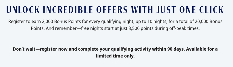 - 活動內容:註冊後,在選定的酒店入住,每晚可額外的 1000 獎勵積分,以及雙倍房晚;上限 20k 積分和 20 個額外房晚。