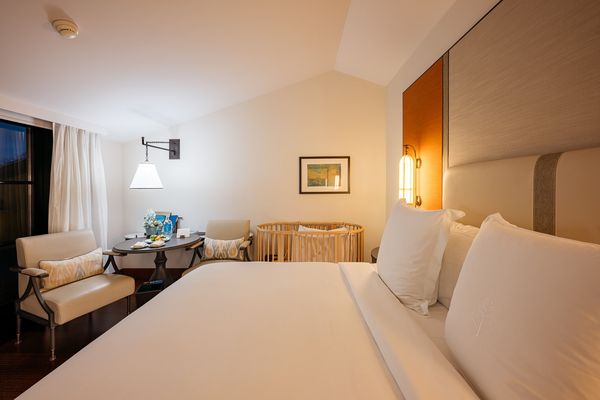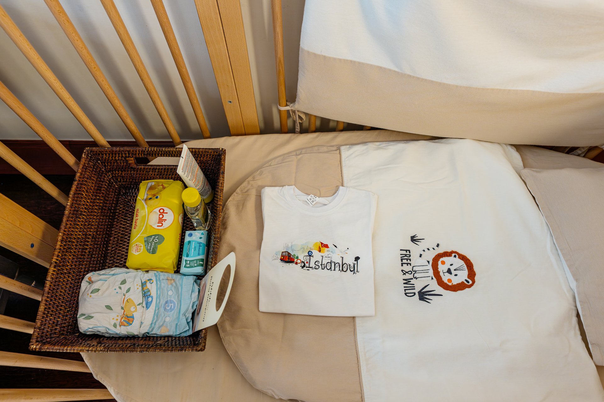 因为提前沟通了有小朋友入住,酒店在我们房间还布置了 crib 和一些小朋友用品:crib 里放了湿纸巾和尿布,给小朋友送了玩具和衣服,厕所还放了尿布桶。细节满分。