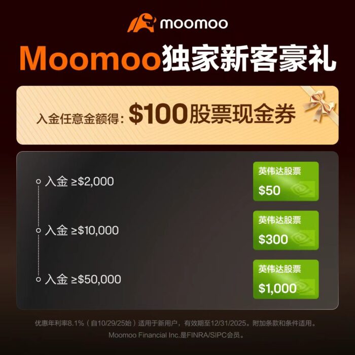 【2025.10 更新】通过美卡链接注册,限时加码 $100 美股现金券,参与Moomoo模拟交易大赛还能参与瓜分奖池、解锁行情权限,并获得加磅现金奖励(详见下文)。以上加码福利均可叠加最高$1,000 英伟达(NVDA)和8.1% APY。