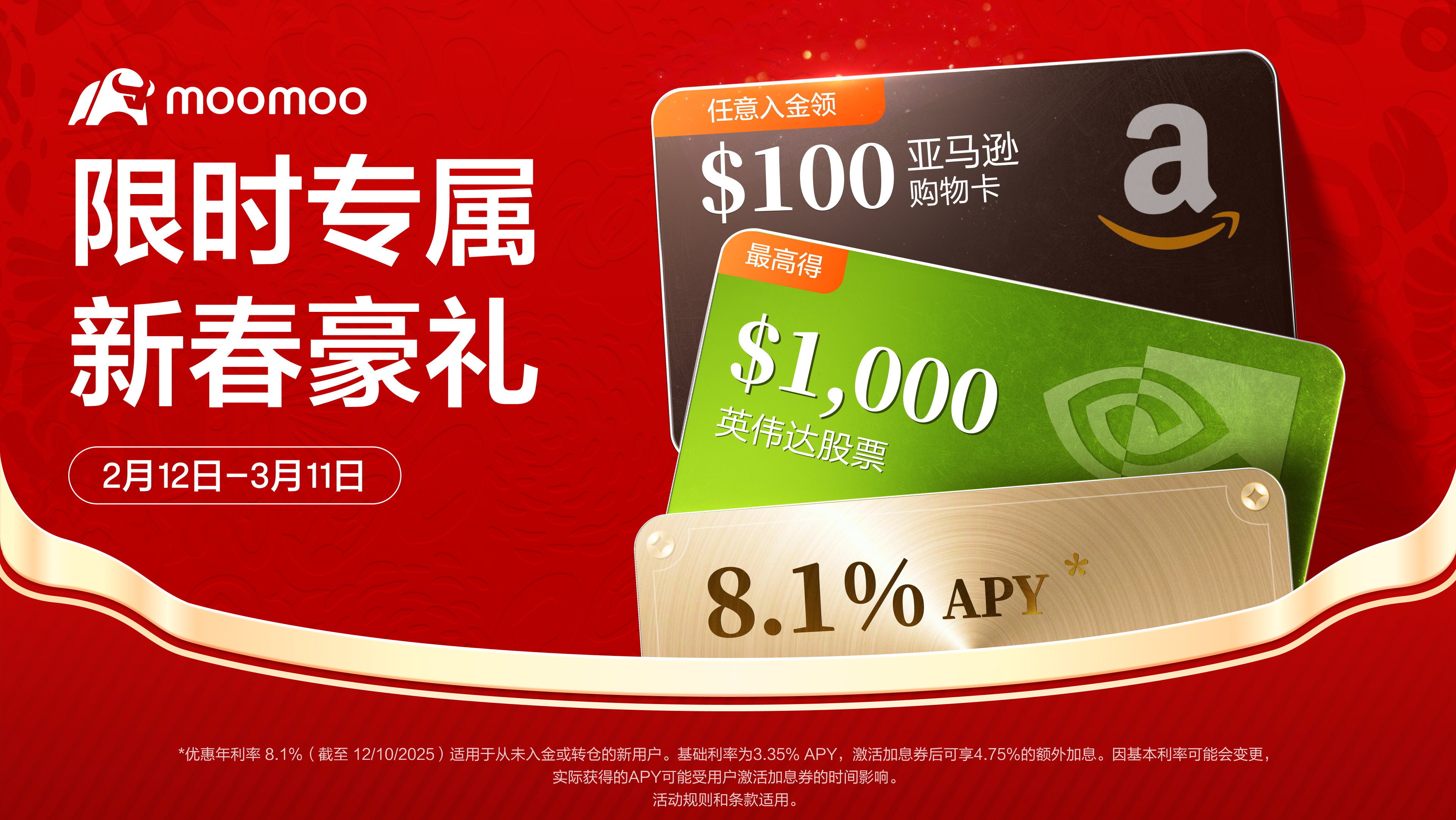【2026.2 更新】Moomoo 和美卡给美国用户的加码专属开户奖励,入金就送$100亚马逊礼卡!原有福利依旧给力,入金可以领取最高 $1000 NVDA,闲置资金享受 8.1%APY。记得一定要通过我们的链接注册才能拿到!