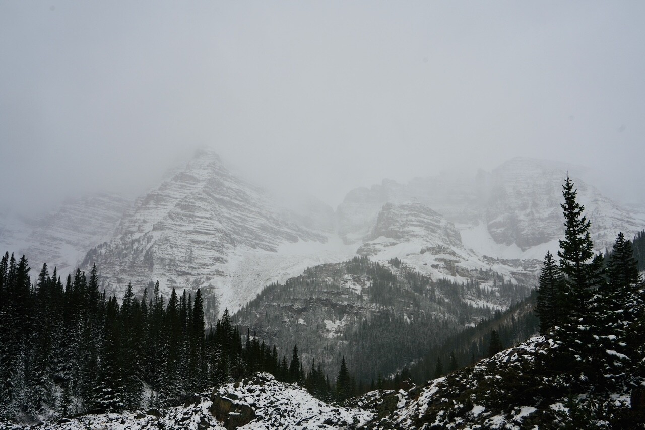 理論上來講,Maroon Bells應該是科州秋景最壯觀的地方(或許可以沒有之一),因為這裡combine了雪山、金秋和湖泊,運氣好可以拍到上圖賣家秀。然而這裡算科州 peak 比較早的,我們到的時候這裡已經past peak兩周左右,而且還趕上下雪,只拍到了下面的賣家秀 ![]()