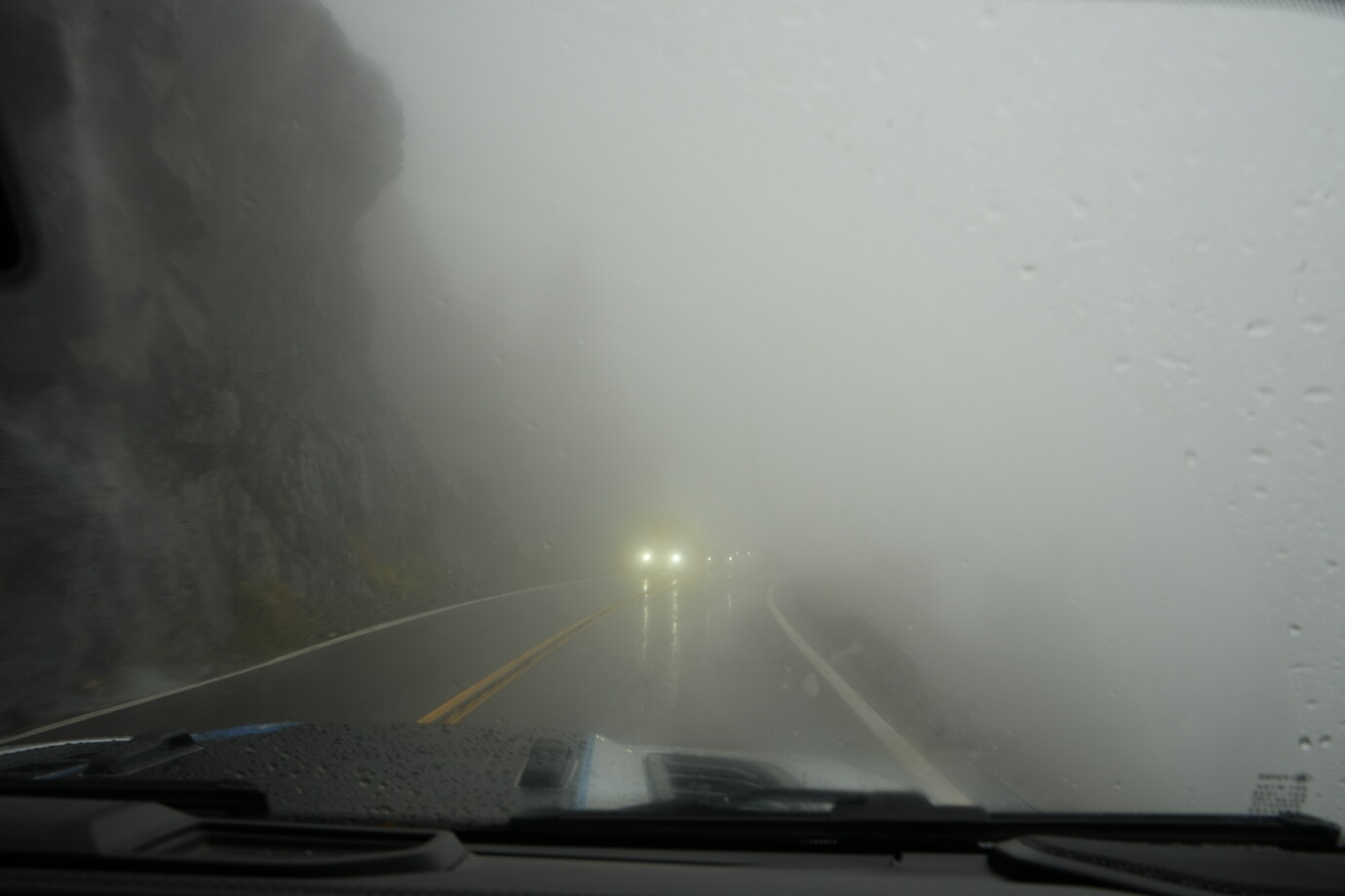 清晨山間霧氣很多,這段路險峻、狹窄,又基本沒有護欄,能見度如圖所示