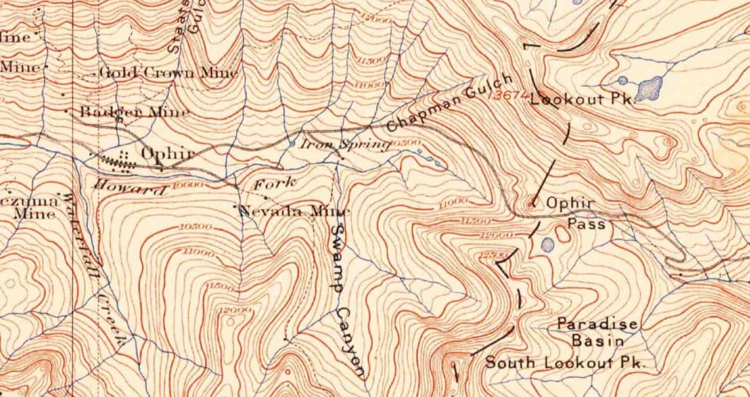 在Silverton稍事休息,往回開一陣子,就到了Ophir Pass的入口。Ophir Pass是一條連接著Silverton和Ophir的offroad,一頭是曾經的礦業遺迹,另一頭則是如今的富人度假區Telluride。這條路的興起也要說回到19世紀的礦業熱潮,當時周邊的Silverton、Telluride、Ouray、Ophir 等礦區同時崛起,但彼此之間被高山深谷阻隔,急需一條可供馬車通行的線路。那時候科羅拉多並沒有完善的州道或聯邦道路系統。所有越嶺路線(mountain passes)都是由私人或礦業公司修建,靠收費來維護運營,而Ophir Pass正是為了Silverton ↔ Ophir ↔ Telluride 的銀礦運輸路線而建立的。早在1897年的USGS Topo Quad中就已經有Ophir Pass的存在了: