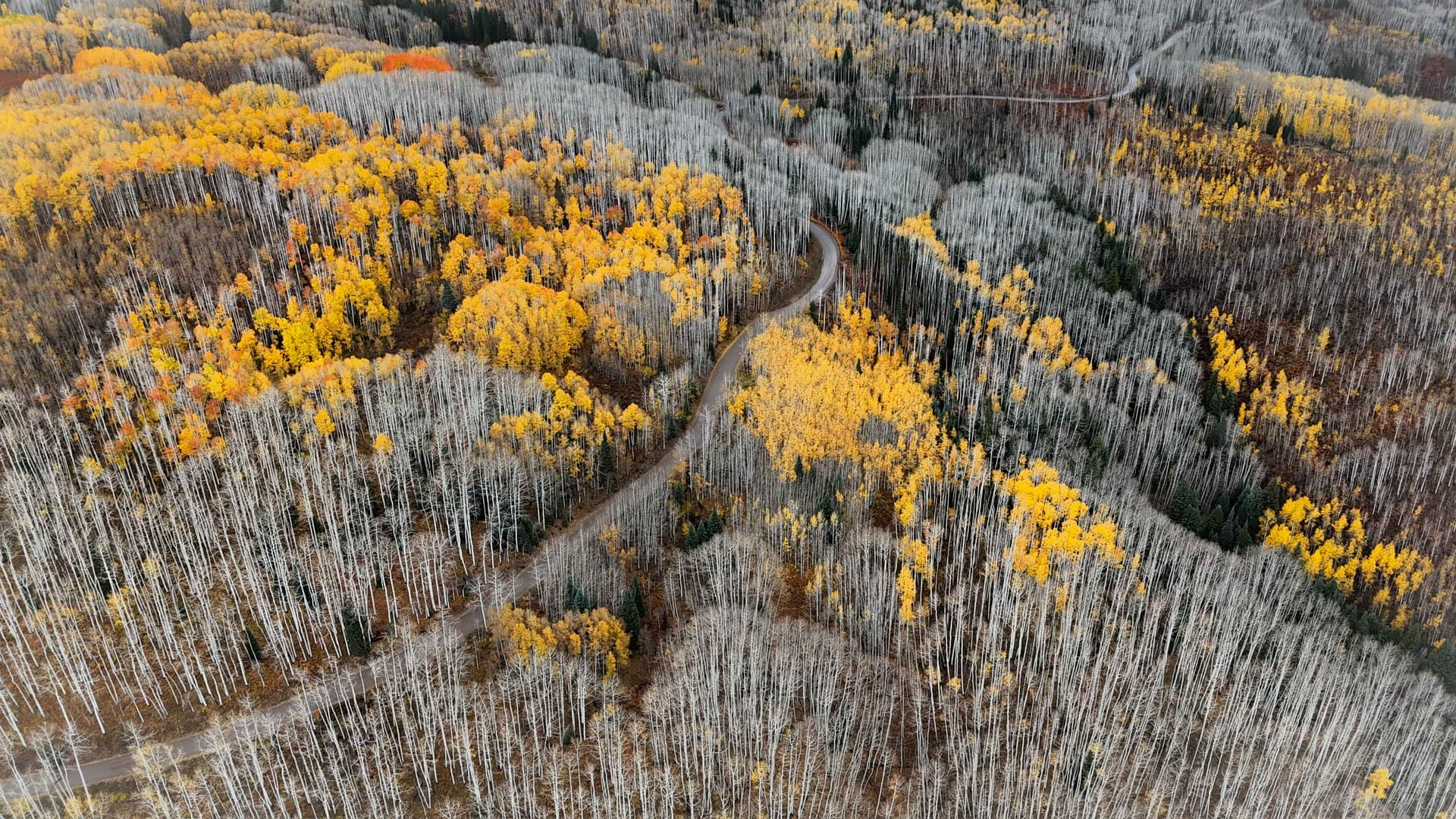 科州金秋以高挑的白楊為主,相比東部富態的紅楓,落葉季高空機位俯視像朵花一樣綻放不同,這裡的白楊林在落葉季有一份獨特的肅殺,成片落葉後更是像針氈。