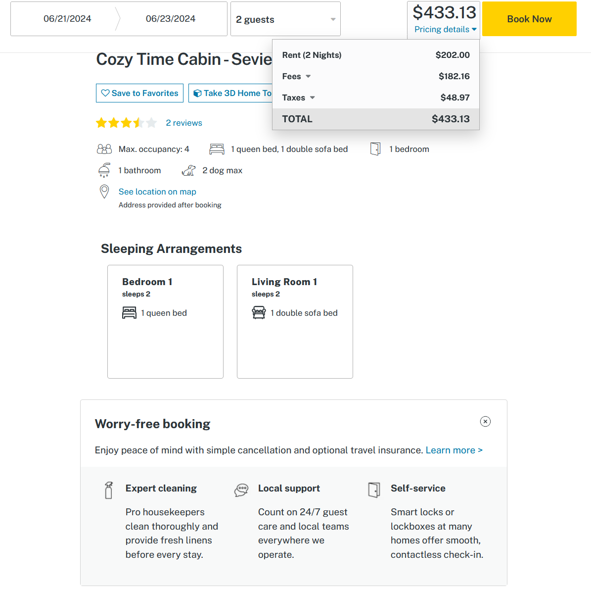 - 一定要点进去感兴趣的度假屋的页面,才能看到税费后的总价,然后用这个总价来计算每卧室每晚的价格;