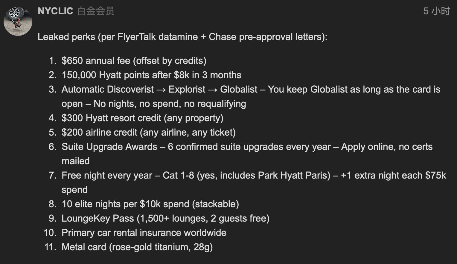 上面的内容都是官方新闻稿原文和阅读理解,下面的内容则是纯属小道消息,大家不要混淆可信度。今天美卡论坛 NYCLIC 发了个回复说Hyatt高端卡将有以下福利: