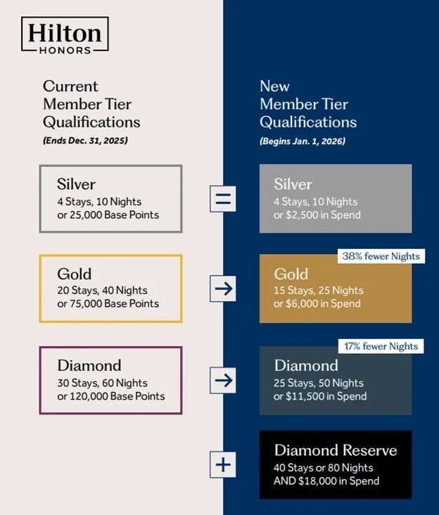 The new tier system starts from Jan 1st, 2026, as a part of the Hilton Honors refresh, the qualification for the other tiers have been reduced: