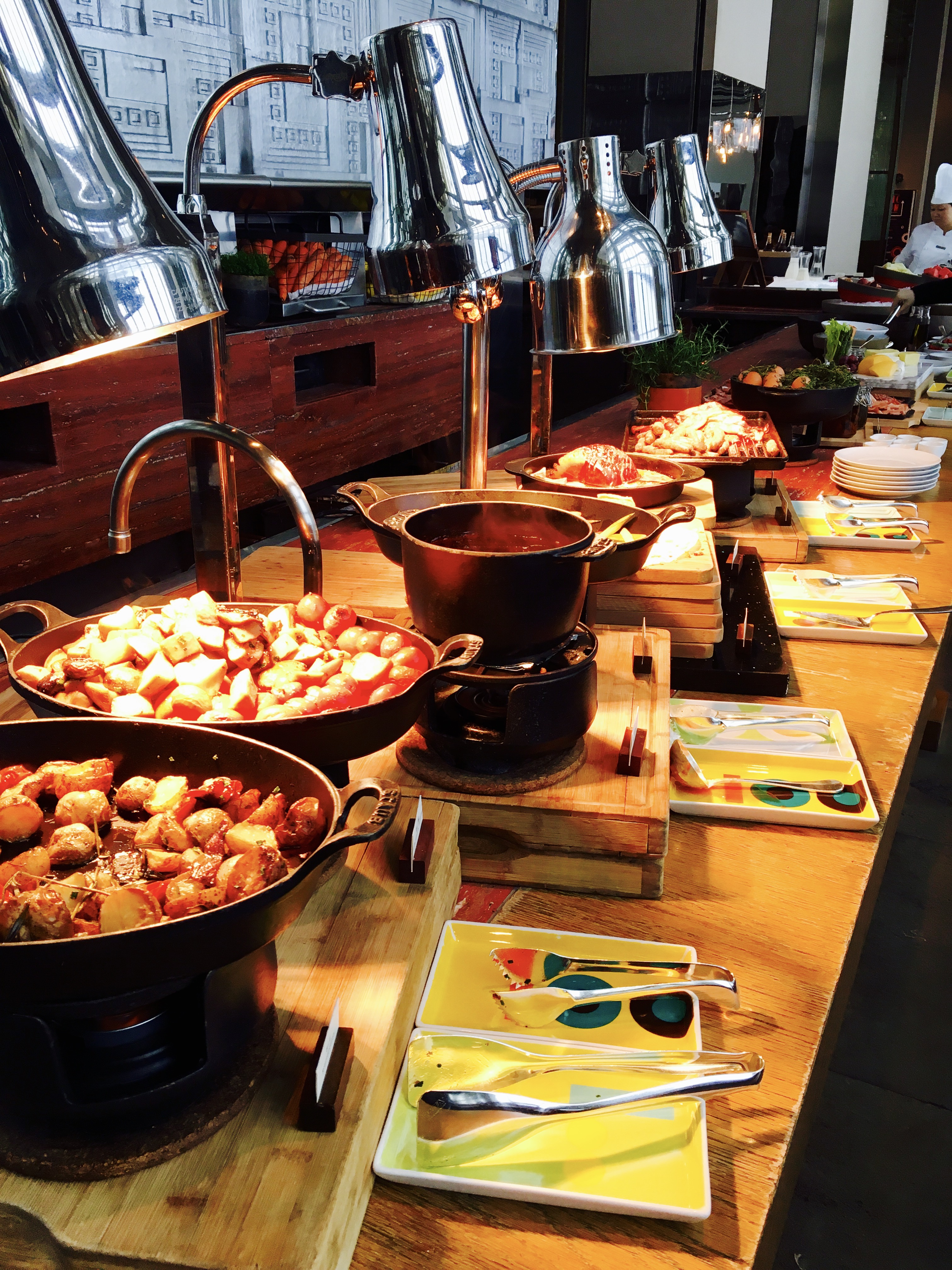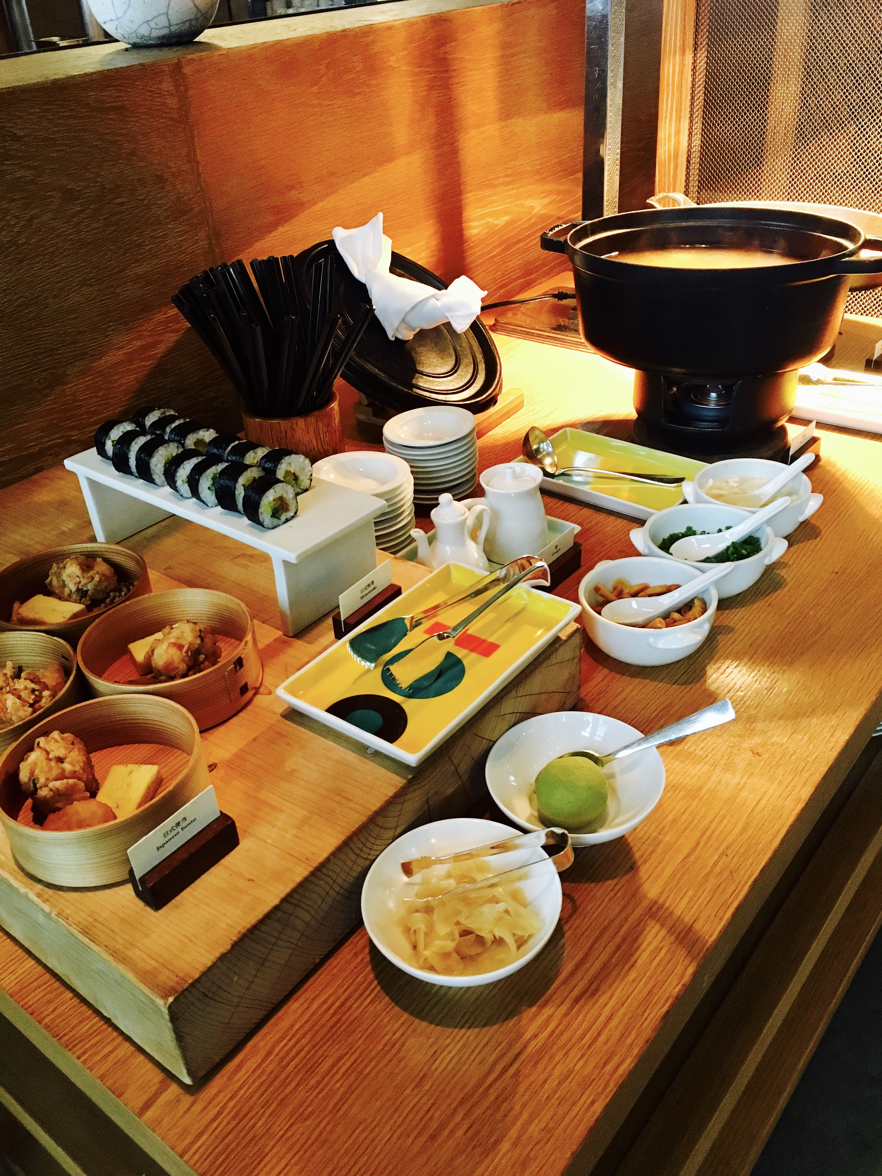 殘暴的早飯有木有!教科書式的早飯有木有!簡直是在教紐約柏悅如何做早餐!自取區域有中日西三大類食物,每類又分七八個品種。飲料提供鮮榨果汁、牛奶、咖啡、養樂多等等,然而偏偏我想喝的哈密瓜汁沒有!於是就問了一下廚師,立刻給我去榨了一杯出來,好評!此外,還有一份菜單可以點現做的菜品,試了幾樣都很好吃!