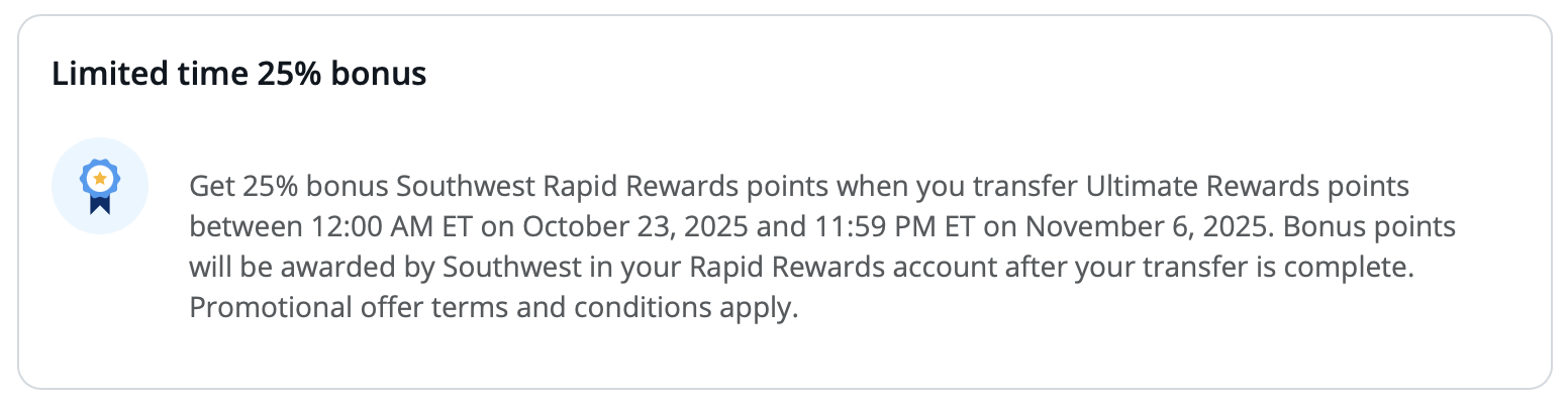 【2025.11 更新】Chase UR -> Southwest Rapid Rewards (WN) 25% Bonus