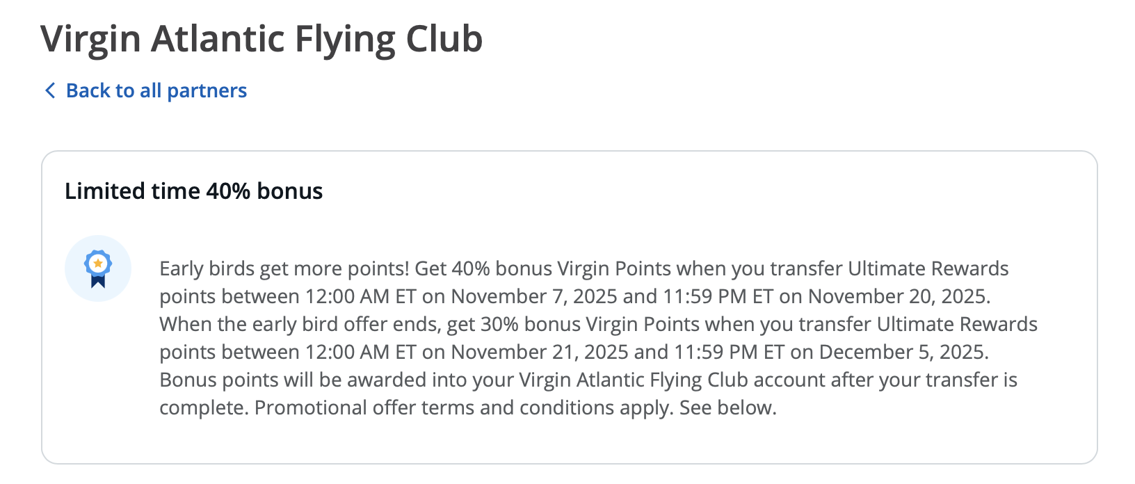 【2025.11 更新】Chase UR -> Virgin Atlantic (VS) Flying Club 40% Bonus