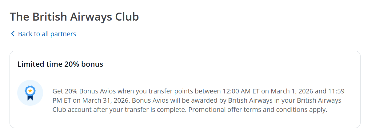 【2026.3 更新】Chase UR -> British Airways Club 20% Bonus