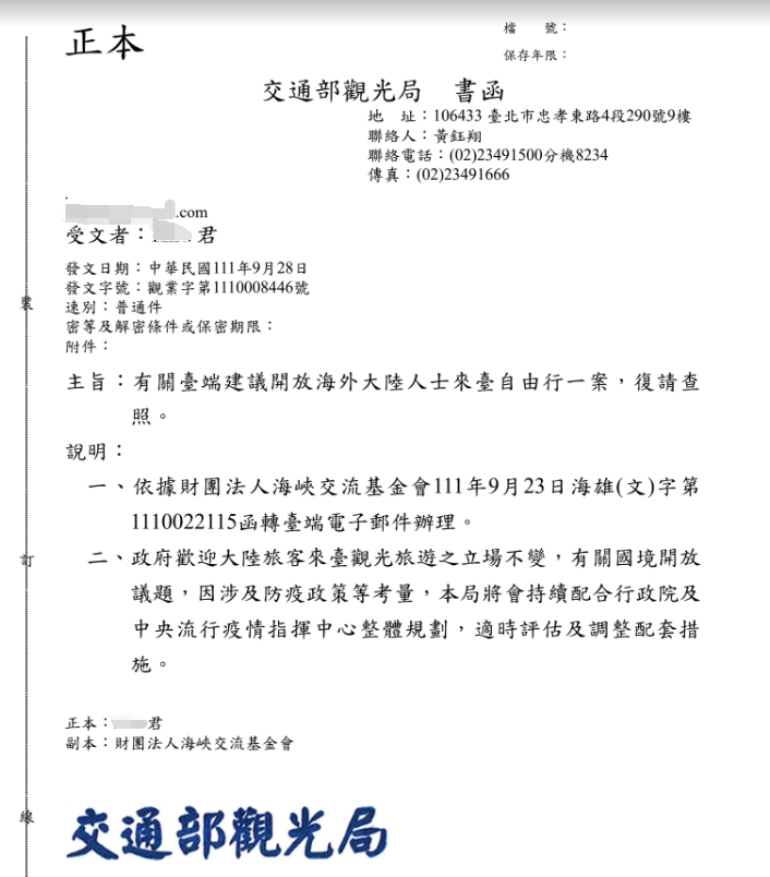 另外根据观察,台湾地区对陆港澳地区人士基本上是同等开放的政策,基本上不存在“开放港澳人赴台但禁止大陆人赴台”(这里只是提及边境开放,与是否需要办理入境许可为两码事),也不存在“开放海外大陆人士赴台但禁止居住在大陆的大陆人士赴台”。目前暂不考虑向“疫情指挥中心”去信,除非10月13日左右台湾地区更进一步开放边境之时没有与大陆人士入境政策之进一步调整。希望这三封去信能对恢复大陆人民尤其是第三类大陆人士的入台观光申请有所助益,两岸敌对螺旋之下,更需要(正如陆委会所回复的) “两岸观光交流有助于两岸关系稳定发展”。