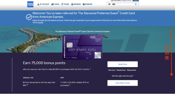 那么问题来了,好像说的很轻松的样子,但是不少朋友会发现我从 referral link 进去看到的明明就还是那一张卡啊,别的卡去哪儿了你们怕不是骗我哟。哈哈,当然不是骗你,点进去第一眼确实看到的就是和你生成 refer 的那张一样的卡,你只要把网页拉到最底下,就可以看到其他几张卡啦!比如用我的 SPG 卡链接当例子,大家点击进去之后看到的当然是 SPG 卡申请页面,然后你拉到页面最底下就会发现 SPG Luxury 卡也躺在那里!