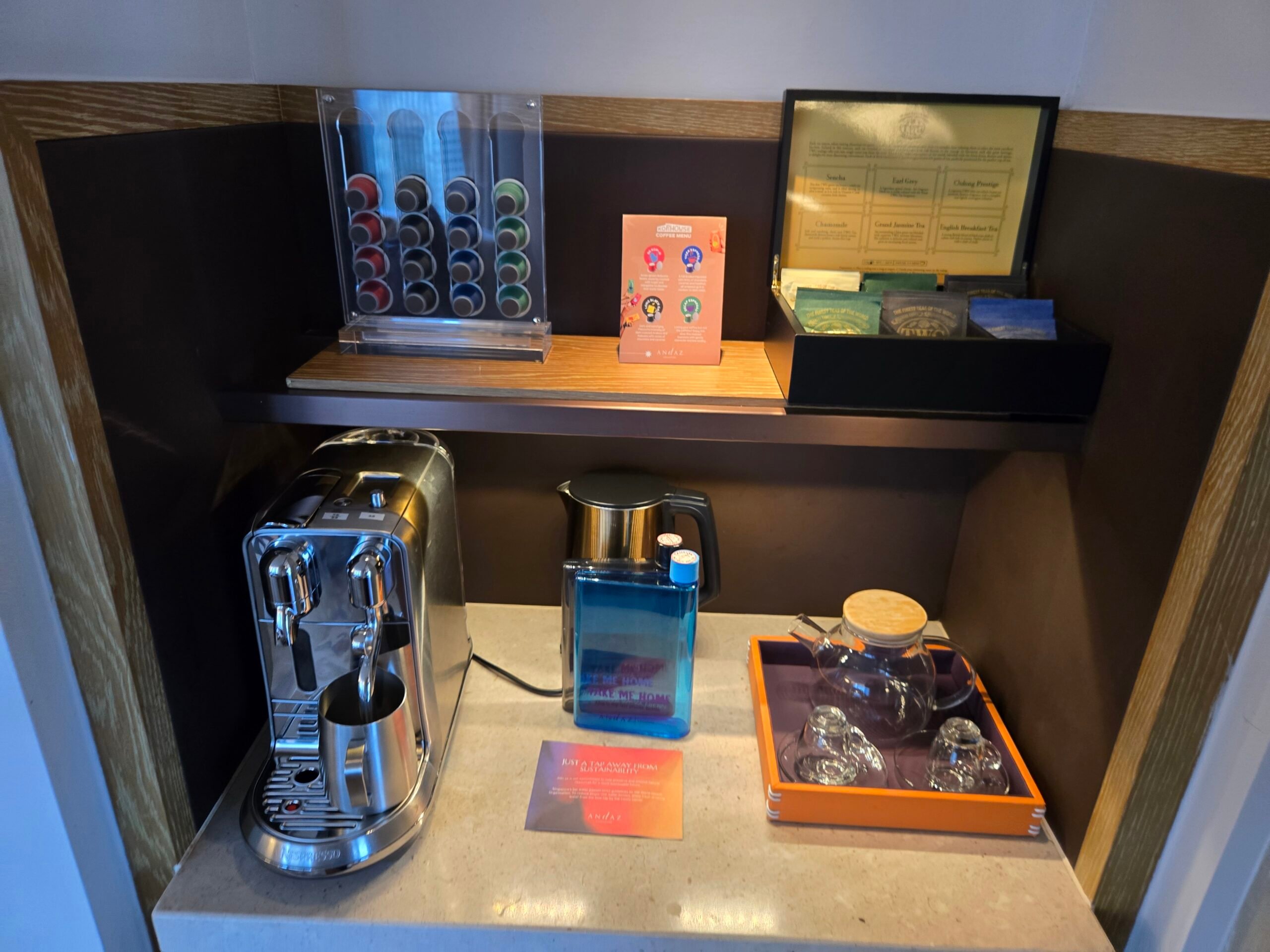套房给了充足的TWG茶以及胶囊咖啡。同时新加坡安达仕一个特点是房间内不给水,建议大家用过滤器过滤后直接饮用。不过实际上是可以要瓶装水的。胶囊咖啡虽然多,但是不是常见的牌子,为了薅羊毛我把一大包胶囊都带回家了,差点把家里的咖啡机搞坏,妥妥的被反撸: