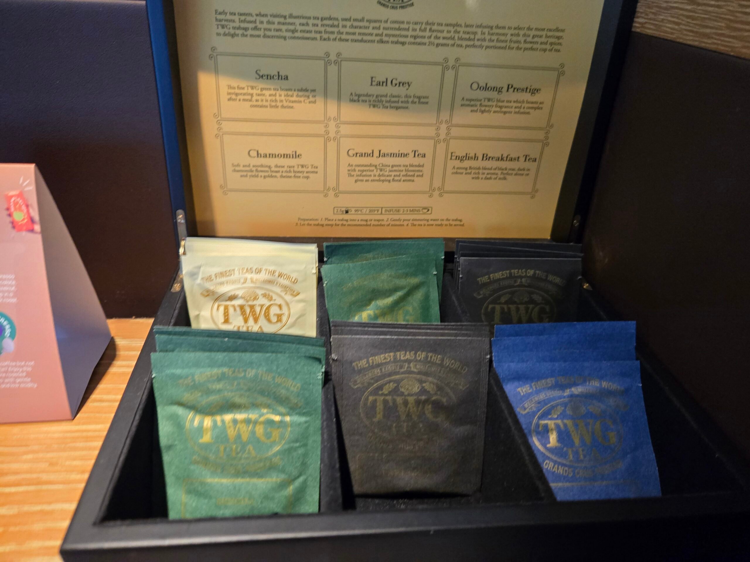 套房给了充足的TWG茶以及胶囊咖啡。同时新加坡安达仕一个特点是房间内不给水,建议大家用过滤器过滤后直接饮用。不过实际上是可以要瓶装水的。胶囊咖啡虽然多,但是不是常见的牌子,为了薅羊毛我把一大包胶囊都带回家了,差点把家里的咖啡机搞坏,妥妥的被反撸: