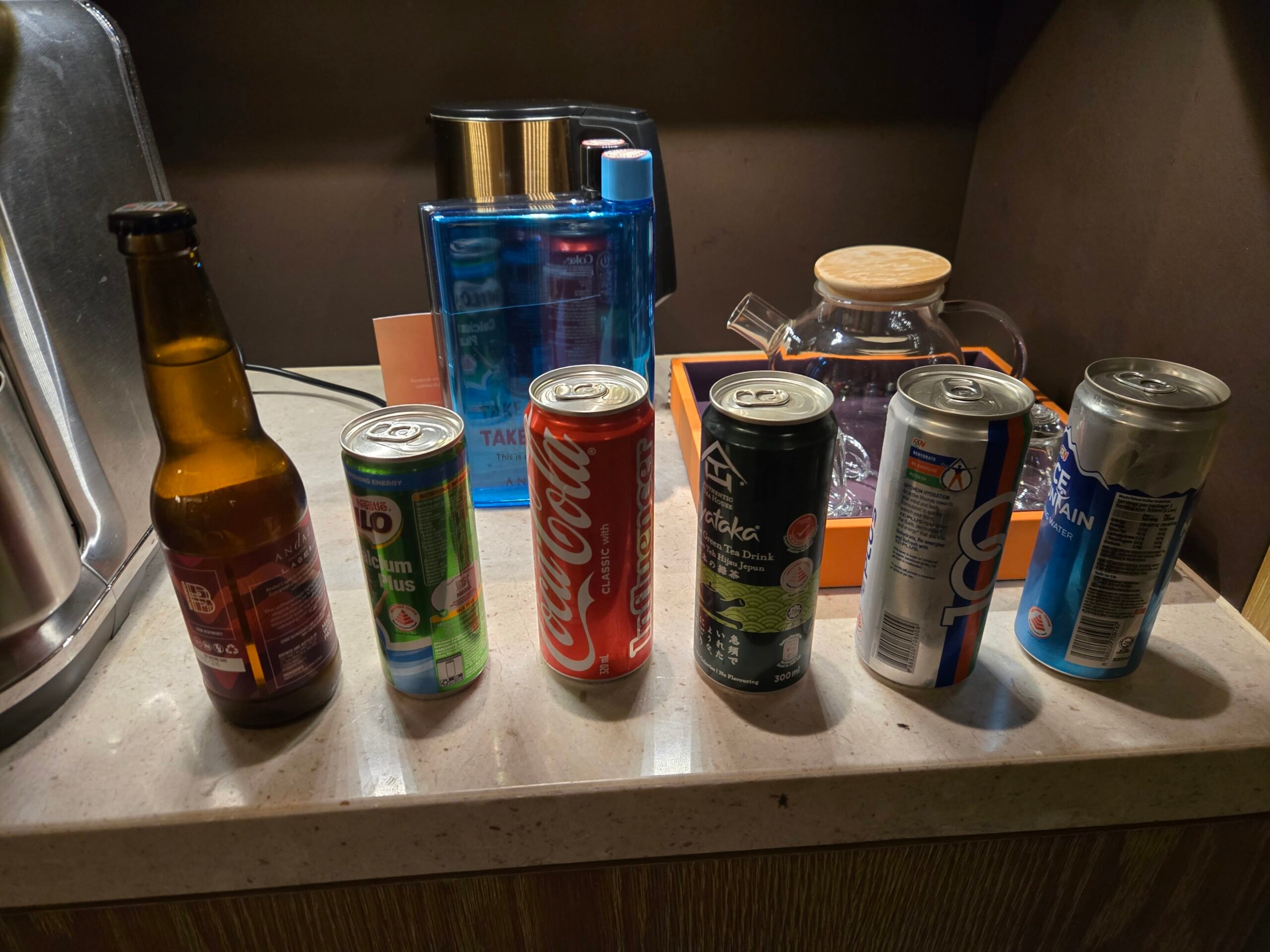 冰箱内每天提供的饮料如下,每天都会refill,全部免费。由于新加坡户外非常炎热,因此除了啤酒外每天我都会带着出门,正好可以解决两人一天的饮水问题: