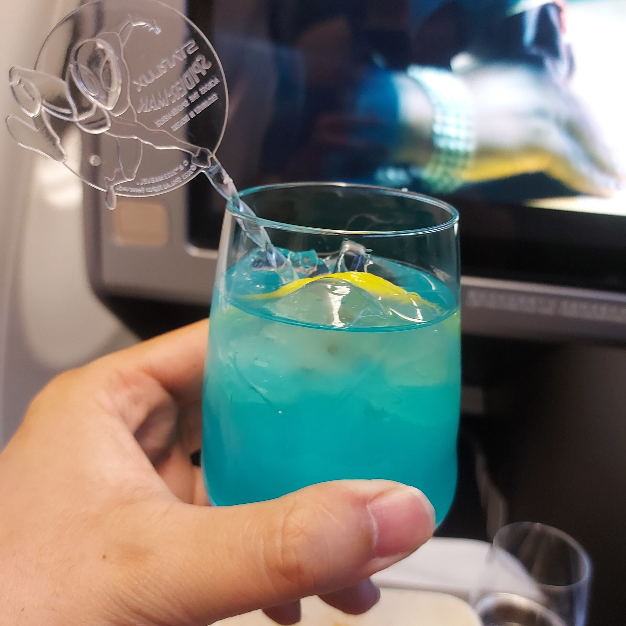 星宇上的鸡尾酒比较有名,选了颜值比较高的湛蓝宇宙2.0,轻饮一口,搂主对酒精反应马上就上来了,体温迅速升高,这酒要是在睡前喝真的容易导致失眠。看了一下别的体验博主的视频,似乎其它的鸡尾酒也是很不错的,有机会可以以后再尝试。由于搂主两段都是夜间飞行,因此那种拿着鸡尾酒对着舷窗外的白云天空的画面是不可能有的啦哈哈。