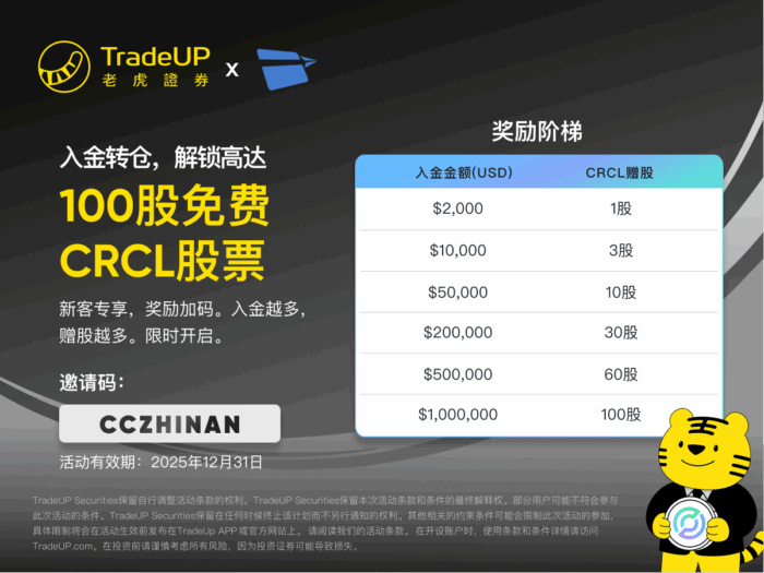 【2025.11 更新】現在的新用戶活動是增股CRCL,入金金額和獎勵金額表格如下,這個獎勵還是挺給力的: