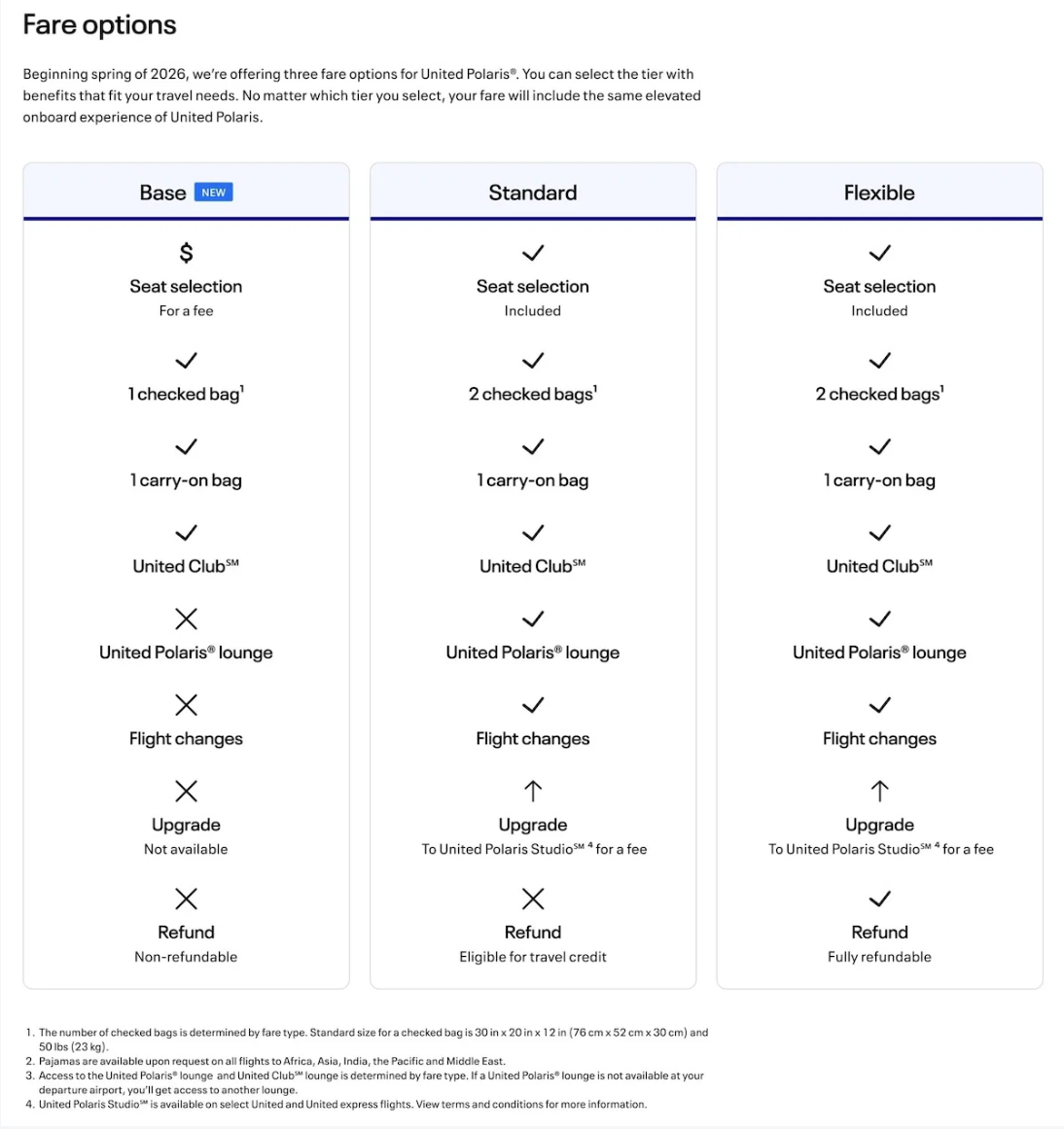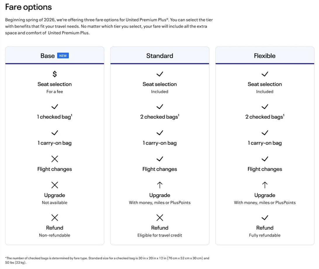 從2026年4月開始,有Base Fare的路線,美聯航官網會把商務艙和豪華經濟艙的三個產品清楚的列出來,旅客可以根據自己需要選購。目前第一批實行Base Fare豪華經濟艙和商務艙的航線為: