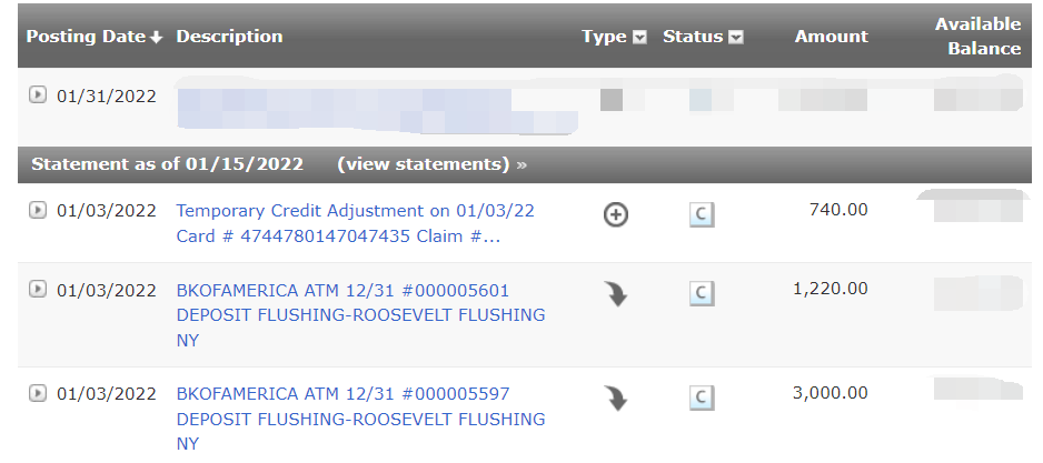 可以看到,搂主12/31存的现金,1/3 clear,而740 USD的credit也于1/3 clear。调查是12/31即开始,当时收到信息Account credited while your claim is researched