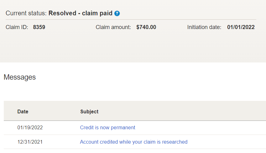 到了1/19收到信息 Credit is now permanent,然后这个claim也变成 Resolved – claim paid。